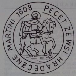 Existence pečeti je doložena k roku 1749 /Státní okresní archiv Brno, D2-RA, č. 237/2/. Obec však měla pečeť a právo jí užívat již od roku 1608 a právě tento letopočet se také nachází na typáři pečeti. Pečeť je kruhová o průměru 28 mm, v pečetním poli je sakrální motiv vyjadřující příslušnost vsi k farnímu kostelu v Měrotíně. Na pečeti je vyobrazený kostelní patron Svatý Martin, patron vojáků, koní, jezdců, hus a vinařů, jako jezdec na koni jak mečem odděluje část svého pláště a podává ji vedle na zemi klečícímu žebrákovi. Legenda zní : „PECET ZE WSI HRADECZNE MARTINI 1608“