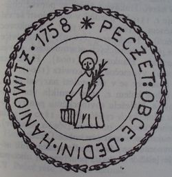 A zde dále mosazné razítko společně s jeho otiskem, které obec Hradečná začala užívat namísto pečeti po roce 1850, kdy se stala samostatnou obcí politického okresu Litovel. V oválném razítku uvnitř věnce z vavřínových ratolestí je legenda : „Gemeinde Hradečzna“.